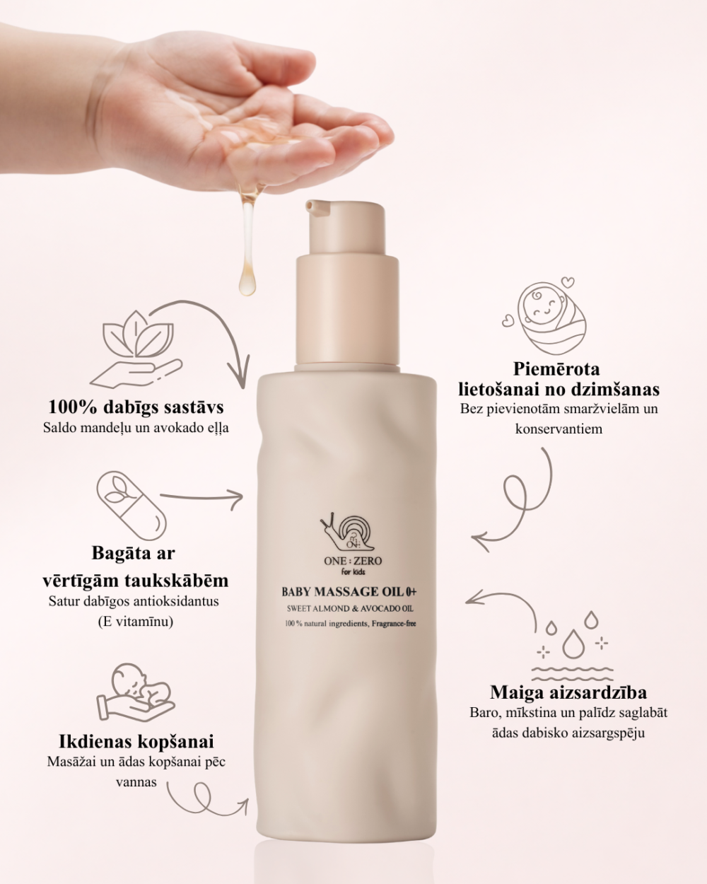 Maiga masāžas eļļa ar saldo mandeļu un avokado eļļu, kas mitrina, mīkstina un aizsargā mazuļa jutīgo ādu jau no pirmajām dzīves dienām. Bez smaržvielām, piemērota ikdienas lietošanai.