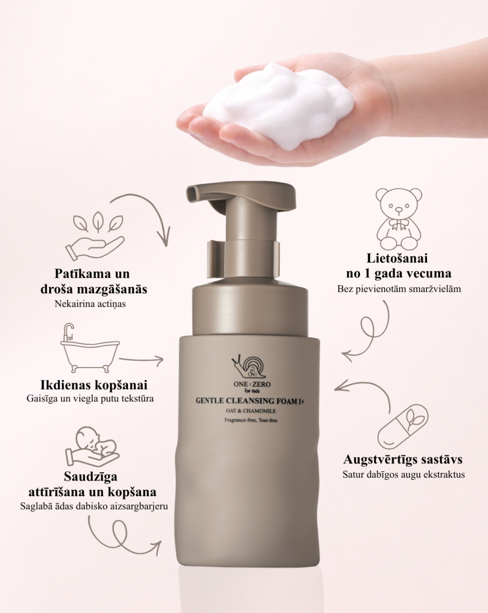 ONE:ZERO for Kids produktu komplekti apvieno rūpīgi izvēlētus matu un ķermeņa kopšanas līdzekļus, kas savstarpēji papildina viens otru un veido drošus un saudzīgus ķermeņa kopšanas rituālus bērniem no pirmajām dzīves dienām līdz pat apzinātiem higiēnas paradumiem.